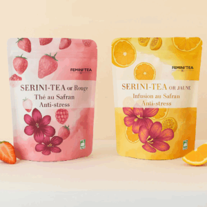 Composition de l’infusion Sereni-tea: Safran, pomme, citronnelle, écorces d’orange, cynorrhodon, hibiscus, mangue, fruit de la passion.